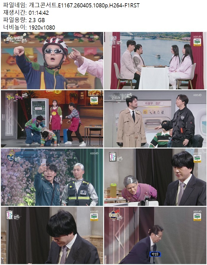 방송/동영상 방송/동영상 개그콘서트.E1167.260405.1080p.H264 디스사랑 2026.04.24 5,979 434 다운로드 추천 434 북마크 공유 다운로드 파일 · 1개 개그콘서트.E1167.260405.1080p.H264-F1RST.mp4 FILE 2.3G 다운로드 TAGS #개그콘서트 #E1167 #H264 #F1RST