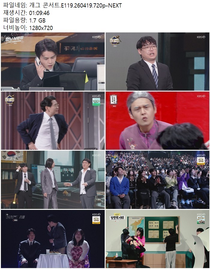 방송/동영상 방송/동영상 개그 콘서트.E119.260419.720p-NEXT 디스사랑 2026.04.22 4,724 337 다운로드 추천 337 북마크 공유 다운로드 파일 · 1개 개그 콘서트.E119.260419.720p-NEXT.mp4 FILE 1.7G 다운로드 TAGS #개그 #콘서트 #E119 #NEXT
