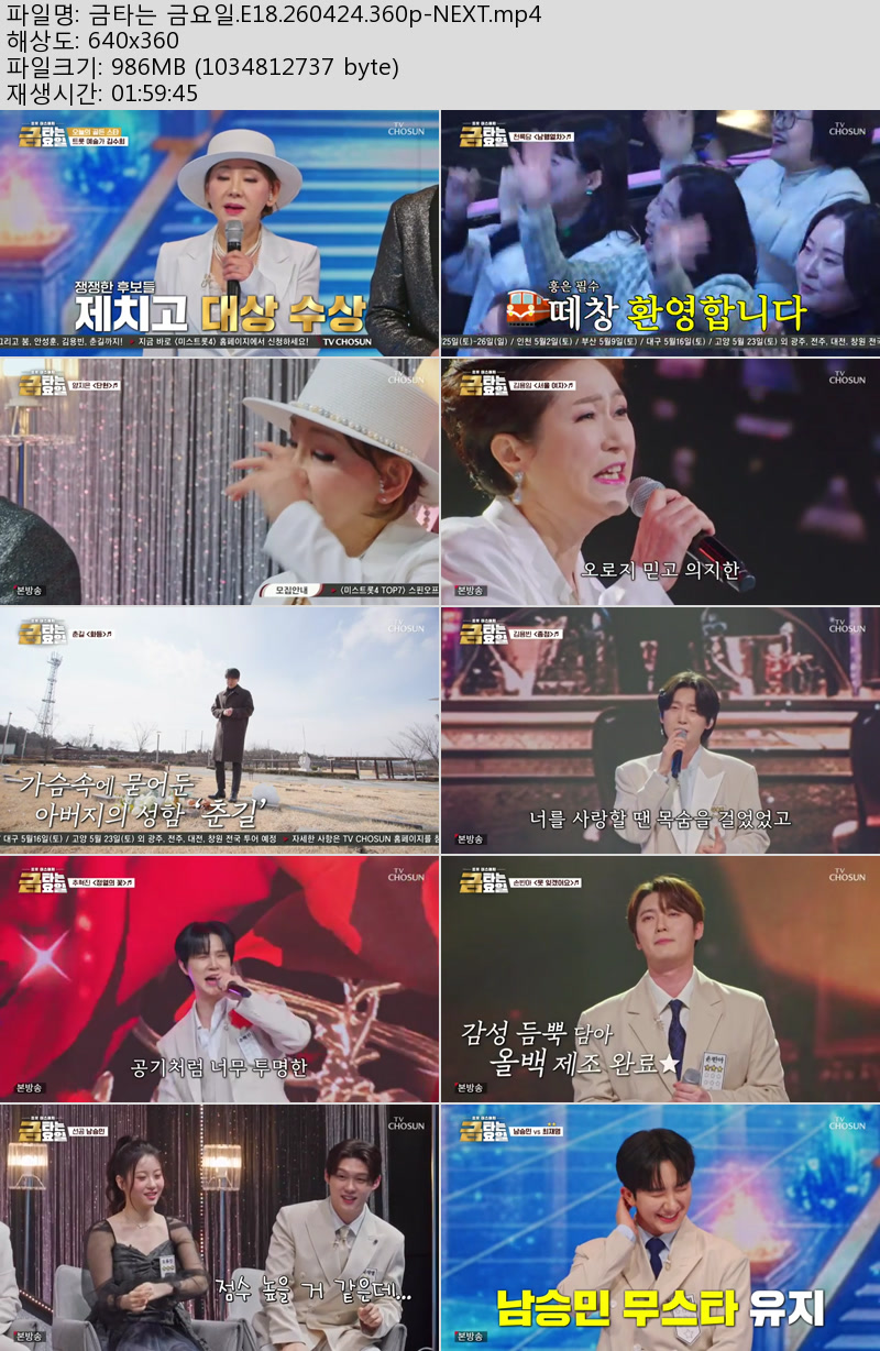 방송/동영상 방송/동영상 금타는 금요일.E18.260424.360p-NEXT 우야쓰꼬 2026.04.25 7,521 267 다운로드 추천 267 북마크 공유 다운로드 파일 · 1개 금타는 금요일.E18.260424.360p-NEXT.mp4 FILE 986.9M 다운로드 TAGS #금타는 #금요일 #E18 #NEXT