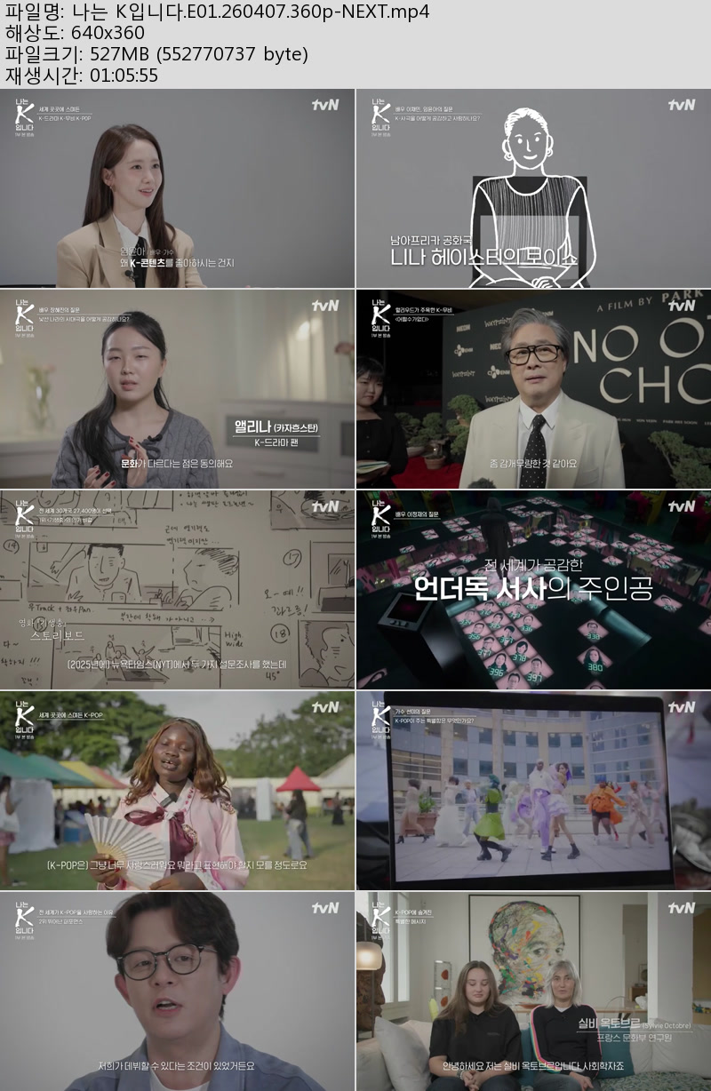 방송/동영상 방송/동영상 나는 K입니다.E01.260407.360p-NEXT 우야쓰꼬 2026.04.24 7,725 314 다운로드 추천 314 북마크 공유 다운로드 파일 · 1개 나는 K입니다.E01.260407.360p-NEXT.mp4 FILE 527.2M 다운로드 TAGS #나는 #K입니다 #E01 #NEXT