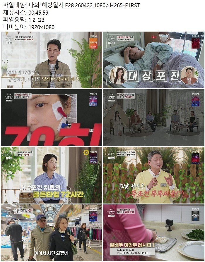 방송/동영상 방송/동영상 나의 해방일지.E28.260422.1080p.H265 디스사랑 2026.04.23 7,290 335 다운로드 추천 335 북마크 공유 다운로드 파일 · 1개 나의 해방일지.E28.260422.1080p.H265-F1RST.mp4 FILE 1.2G 다운로드 TAGS #나의 #해방일지 #E28 #H265 #F1RST