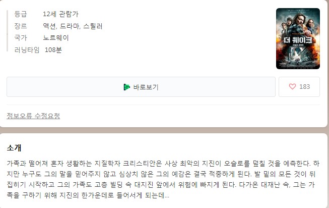 영화 영화 노르웨이 오슬로 대지진(자체자막) 양봉 2026.04.24 3,179 221 다운로드 추천 221 북마크 공유 다운로드 파일 · 1개 2021 지진 (노르웨이 재난).mkv FILE 2.9G 다운로드 TAGS #노르웨이 #오슬로 #대지진 #자체자막 #지진