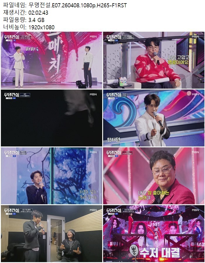 방송/동영상 방송/동영상 무명전설.E07.260408.1080p.H265 디스사랑 2026.04.24 5,504 320 다운로드 추천 320 북마크 공유 다운로드 파일 · 1개 무명전설.E07.260408.1080p.H265-F1RST.mp4 FILE 3.4G 다운로드 TAGS #무명전설 #E07 #H265 #F1RST