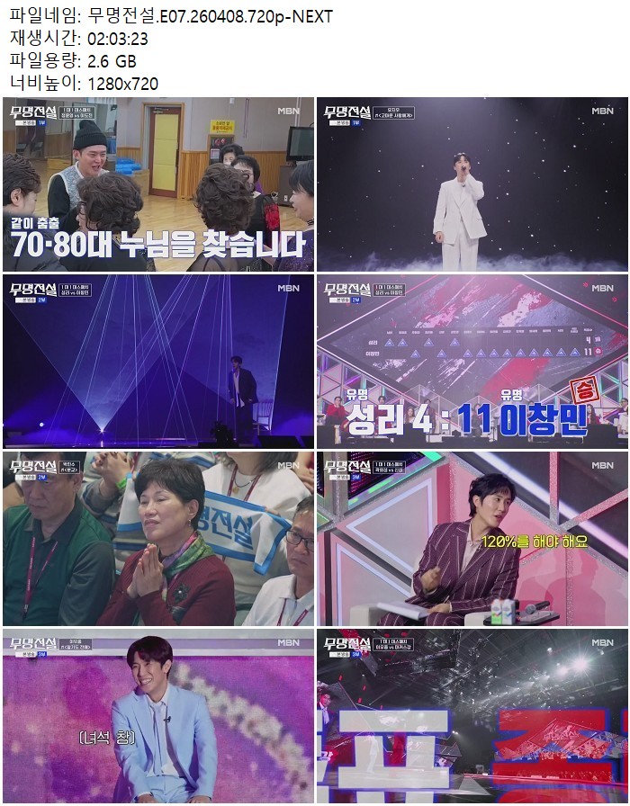 방송/동영상 방송/동영상 무명전설.E07.260408.720p-NEXT 디스사랑 2026.04.24 4,985 422 다운로드 추천 422 북마크 공유 다운로드 파일 · 1개 무명전설.E07.260408.720p-NEXT.mp4 FILE 2.6G 다운로드 TAGS #무명전설 #E07 #NEXT