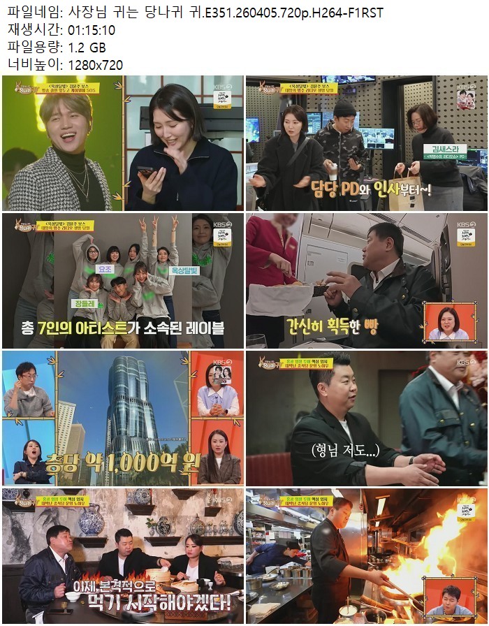 방송/동영상 방송/동영상 사장님 귀는 당나귀 귀.E351.260405.720p.H264 디스사랑 2026.04.24 6,328 207 다운로드 추천 207 북마크 공유 다운로드 파일 · 1개 사장님 귀는 당나귀 귀.E351.260405.720p.H264-F1RST.mp4 FILE 1.2G 다운로드 TAGS #사장님 #귀는 #당나귀 #E351 #H264