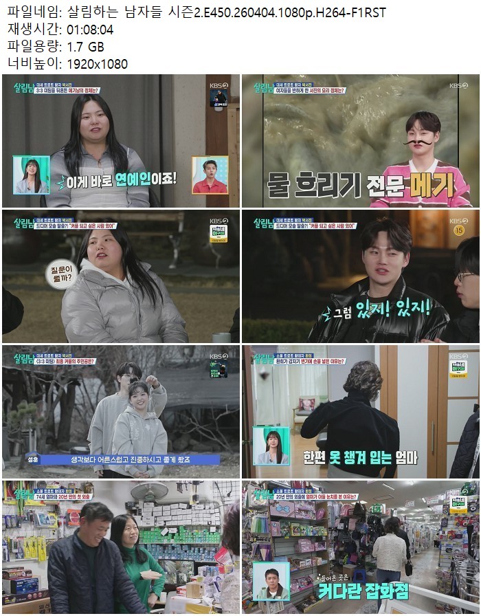 방송/동영상 방송/동영상 살림하는 남자들 시즌2.E450.260404.1080p.H264 디스사랑 2026.04.24 7,841 310 다운로드 추천 310 북마크 공유 다운로드 파일 · 1개 살림하는 남자들 시즌2.E450.260404.1080p.H264-F1RST.mp4 FILE 1.7G 다운로드 TAGS #살림하는 #남자들 #시즌2 #E450 #H264