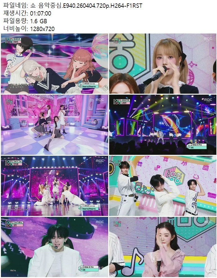 방송/동영상 방송/동영상 쇼 음악중심.E940.260404.720p.H264 디스사랑 2026.04.24 7,364 230 다운로드 추천 230 북마크 공유 다운로드 파일 · 1개 쇼! 음악중심.E940.260404.720p.H264-F1RST.mp4 FILE 1.6G 다운로드 TAGS #음악중심 #E940 #H264 #F1RST