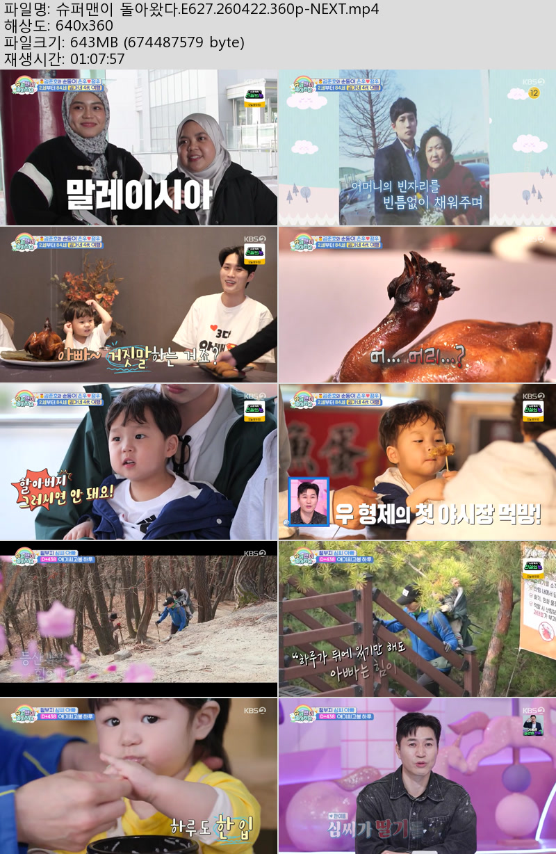 방송/동영상 방송/동영상 슈퍼맨이 돌아왔다.E627.260422.360p-NEXT 우야쓰꼬 2026.04.22 4,314 403 다운로드 추천 403 북마크 공유 다운로드 파일 · 1개 슈퍼맨이 돌아왔다.E627.260422.360p-NEXT.mp4 FILE 643.2M 다운로드 TAGS #슈퍼맨이 #돌아왔다 #E627 #NEXT