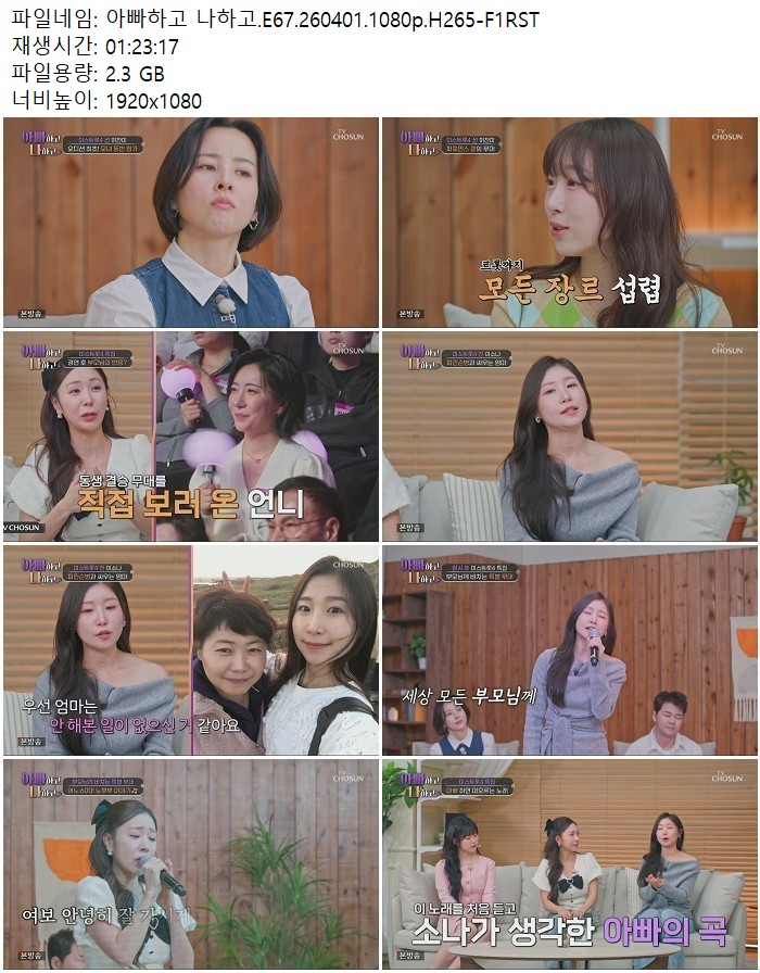 방송/동영상 방송/동영상 아빠하고 나하고.E67.260401.1080p.H265 디스사랑 2026.04.24 6,105 447 다운로드 추천 447 북마크 공유 다운로드 파일 · 1개 아빠하고 나하고.E67.260401.1080p.H265-F1RST.mp4 FILE 2.3G 다운로드 TAGS #아빠하고 #나하고 #E67 #H265 #F1RST