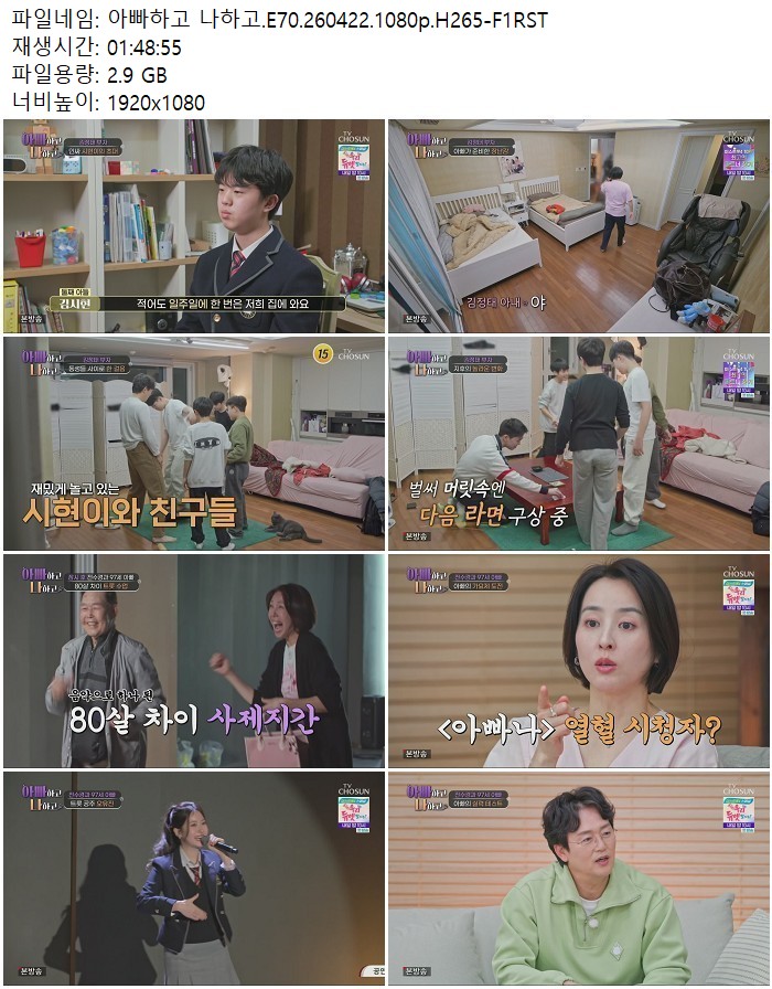 방송/동영상 방송/동영상 아빠하고 나하고.E70.260422.1080p.H265 디스사랑 2026.04.23 6,456 448 다운로드 추천 448 북마크 공유 다운로드 파일 · 1개 아빠하고 나하고.E70.260422.1080p.H265-F1RST.mp4 FILE 2.9G 다운로드 TAGS #아빠하고 #나하고 #E70 #H265 #F1RST