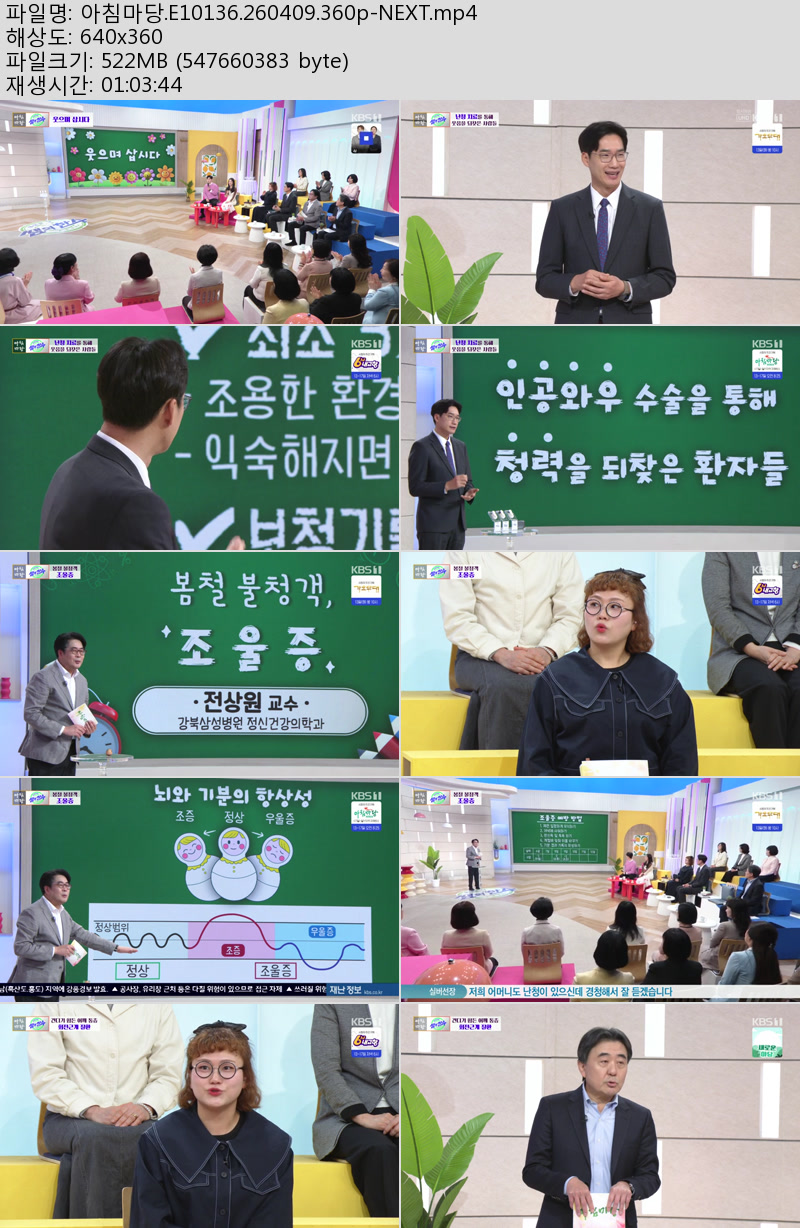 방송/동영상 방송/동영상 아침마당.E10136.260409.360p-NEXT 우야쓰꼬 2026.04.24 4,663 476 다운로드 추천 476 북마크 공유 다운로드 파일 · 1개 아침마당.E10136.260409.360p-NEXT.mp4 FILE 522.3M 다운로드 TAGS #아침마당 #E10136 #NEXT