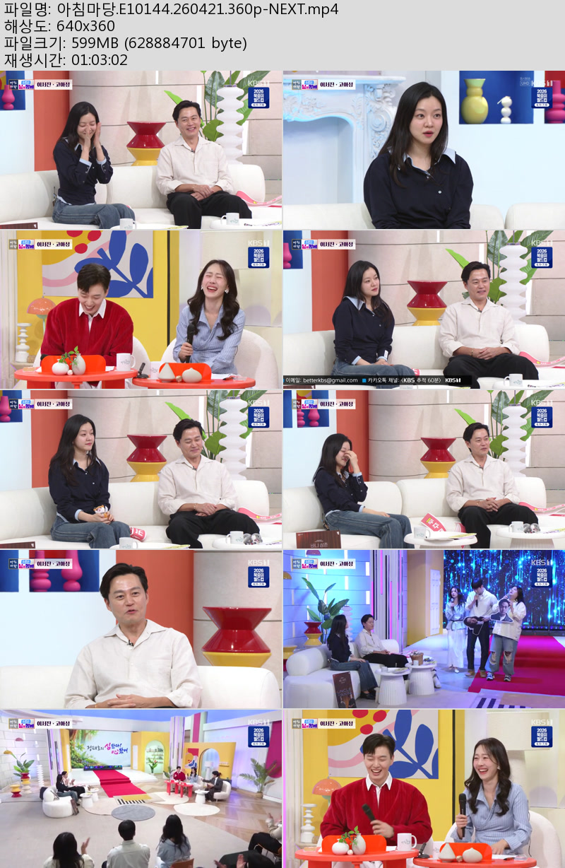 방송/동영상 방송/동영상 아침마당.E10144.260421.360p-NEXT 우야쓰꼬 2026.04.22 3,800 215 다운로드 추천 215 북마크 공유 다운로드 파일 · 1개 아침마당.E10144.260421.360p-NEXT.mp4 FILE 599.8M 다운로드 TAGS #아침마당 #E10144 #NEXT