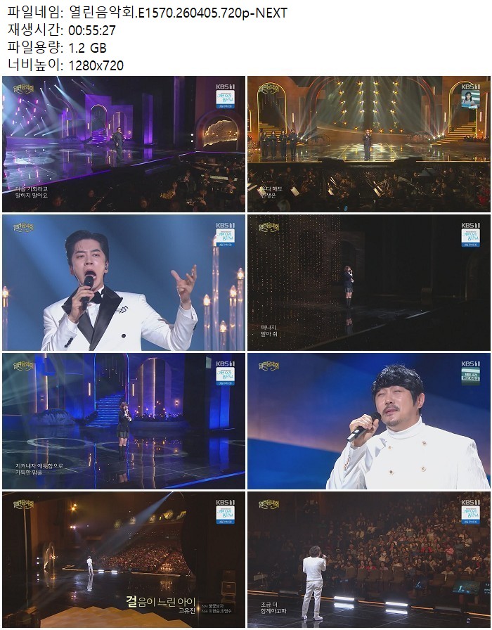 방송/동영상 방송/동영상 열린음악회.E1570.260405.720p-NEXT 디스사랑 2026.04.24 7,712 402 다운로드 추천 402 북마크 공유 다운로드 파일 · 1개 열린음악회.E1570.260405.720p-NEXT.mp4 FILE 1.2G 다운로드 TAGS #열린음악회 #E1570 #NEXT
