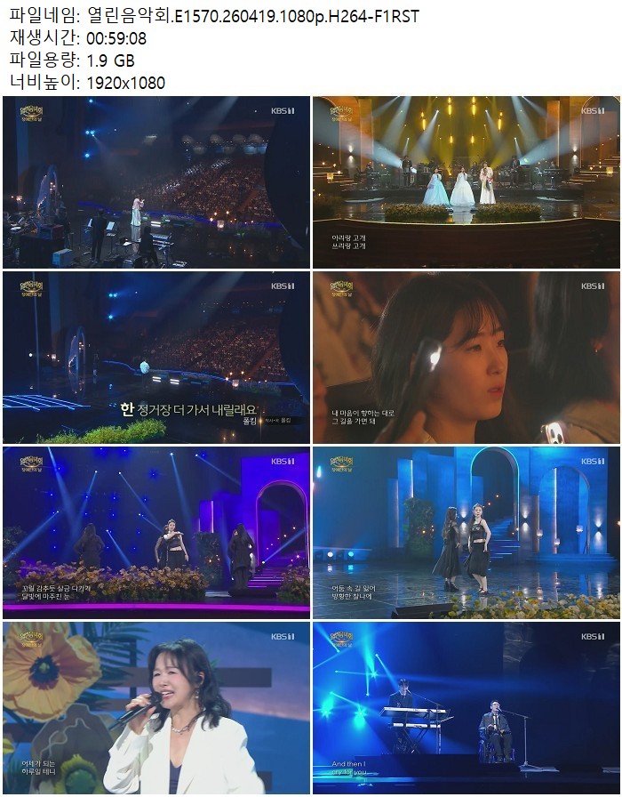방송/동영상 방송/동영상 열린음악회.E1570.260419.1080p.H264 디스사랑 2026.04.22 3,082 345 다운로드 추천 345 북마크 공유 다운로드 파일 · 1개 열린음악회.E1570.260419.1080p.H264-F1RST.mp4 FILE 1.9G 다운로드 TAGS #열린음악회 #E1570 #H264 #F1RST