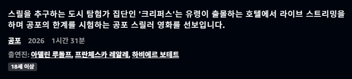 영화 영화 [영화-공포 19] 두 낫 엔터.Do Not Enter.2026.1080p.한글자막 인운트 2026.04.24 3,756 242 다운로드 추천 242 북마크 공유 다운로드 파일 · 1개 [영화-공포 19] 두 낫 엔터.Do Not Enter.2026.1080p.한글자막 FILE 1.7G 다운로드 TAGS #영화 #공포 #엔터 #Do #Not