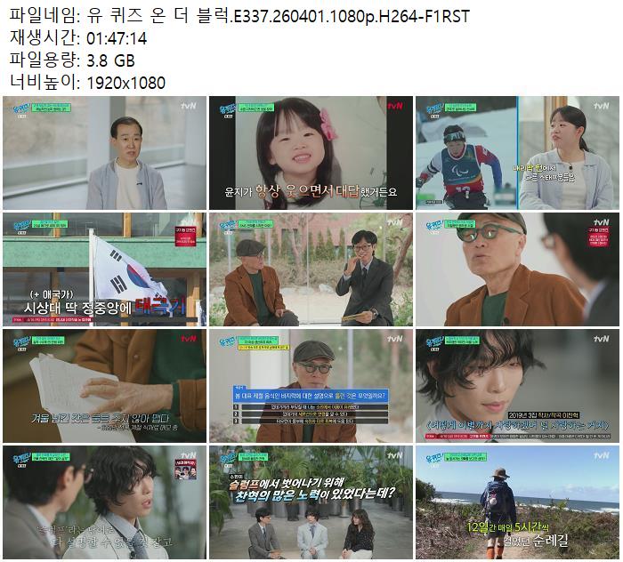 방송/동영상 방송/동영상 유 퀴즈 온 더 블럭.E337.260401.1080p.H264-F1RST zndhkgkgk 2026.04.24 7,032 309 다운로드 추천 309 북마크 공유 다운로드 파일 · 1개 유 퀴즈 온 더 블럭.E337.260401.1080p.H264-F1RST.mp4 FILE 3.8G 다운로드 TAGS #퀴즈 #블럭 #E337 #H264 #F1RST