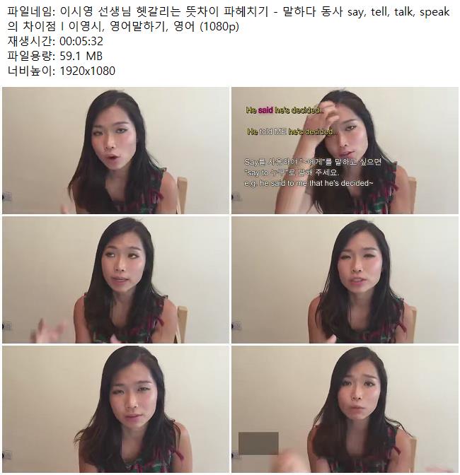 애니메이션 애니메이션 이시영 선생님 헷갈리는 뜻차이 파헤치기 - 말하다 동사 say, tell.. 쿠무 2026.04.24 3,959 369 다운로드 추천 369 북마크 공유 다운로드 파일 · 1개 이시영 선생님 헷갈리는 뜻차이 파헤치기 - 말하다 동사 say, tell, talk.. FILE 59.1M 다운로드 TAGS #이시영 #선생님 #헷갈리는 #뜻차이 #파헤치기