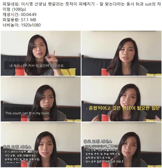 애니메이션 애니메이션 이시영 선생님 헷갈리는 뜻차이 파헤치기 - 잘 맞는다라는 동사 fi.. 쿠무 2026.04.24 7,686 251 다운로드 추천 251 북마크 공유 다운로드 파일 · 1개 이시영 선생님 헷갈리는 뜻차이 파헤치기 - 잘 맞는다라는 동사 fit과 su.. FILE 57.1M 다운로드 TAGS #이시영 #선생님 #헷갈리는 #뜻차이 #파헤치기