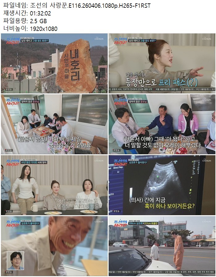 방송/동영상 방송/동영상 조선의 사랑꾼.E116.260406.1080p.H265 디스사랑 2026.04.24 6,227 423 다운로드 추천 423 북마크 공유 다운로드 파일 · 1개 조선의 사랑꾼.E116.260406.1080p.H265-F1RST.mp4 FILE 2.5G 다운로드 TAGS #조선의 #사랑꾼 #E116 #H265 #F1RST