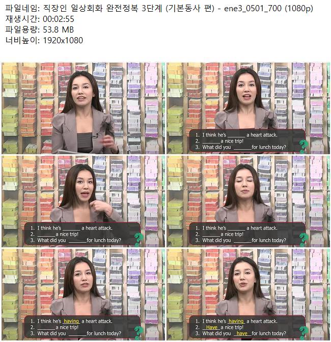 애니메이션 애니메이션 직장인 일상회화 완전정복 3단계 (기본동사 편) - ene3_0501_700 (.. 쿠무 2026.04.24 5,595 366 다운로드 추천 366 북마크 공유 다운로드 파일 · 1개 직장인 일상회화 완전정복 3단계 (기본동사 편) - ene3_0501_700 (1080p).. FILE 53.8M 다운로드 TAGS #직장인 #일상회화 #완전정복 #3단계 #기본동사
