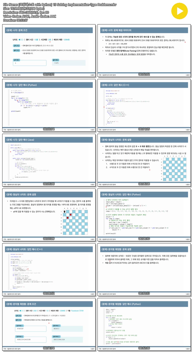 애니메이션 애니메이션 [코딩테스트 with Python] 15 Solving Implementation-Type Problems jibori 2026.04.24 7,984 377 다운로드 추천 377 북마크 공유 다운로드 파일 · 1개 [코딩테스트 with Python] 15 Solving Implementation-Type Problems.mkv FILE 16.9M 다운로드 TAGS #코딩테스트 #with #Python #Solving #Implementation