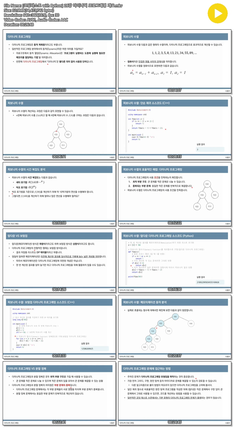 애니메이션 애니메이션 [코딩테스트 with Python] 28강 다이나믹 프로그래밍 개요 jibori 2026.04.24 5,720 498 다운로드 추천 498 북마크 공유 다운로드 파일 · 1개 [코딩테스트 with Python] 28강 다이나믹 프로그래밍 개요.mkv FILE 32.9M 다운로드 TAGS #코딩테스트 #with #Python #28강 #다이나믹