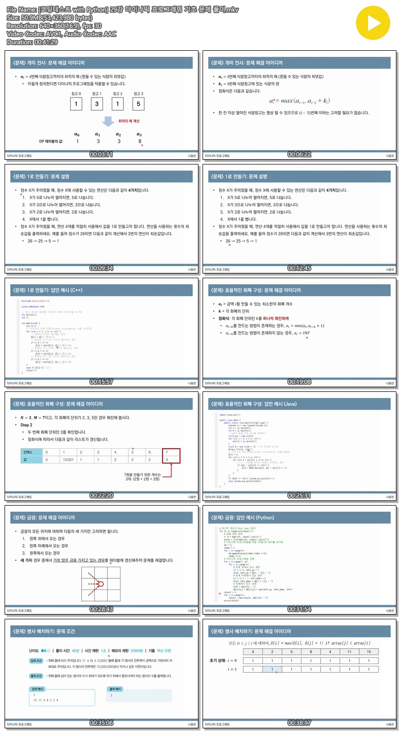 애니메이션 애니메이션 [코딩테스트 with Python] 29강 다이나믹 프로그래밍 기초 문제 풀이 jibori 2026.04.24 7,105 411 다운로드 추천 411 북마크 공유 다운로드 파일 · 1개 [코딩테스트 with Python] 29강 다이나믹 프로그래밍 기초 문제 풀이.mkv FILE 50.9M 다운로드 TAGS #코딩테스트 #with #Python #29강 #다이나믹