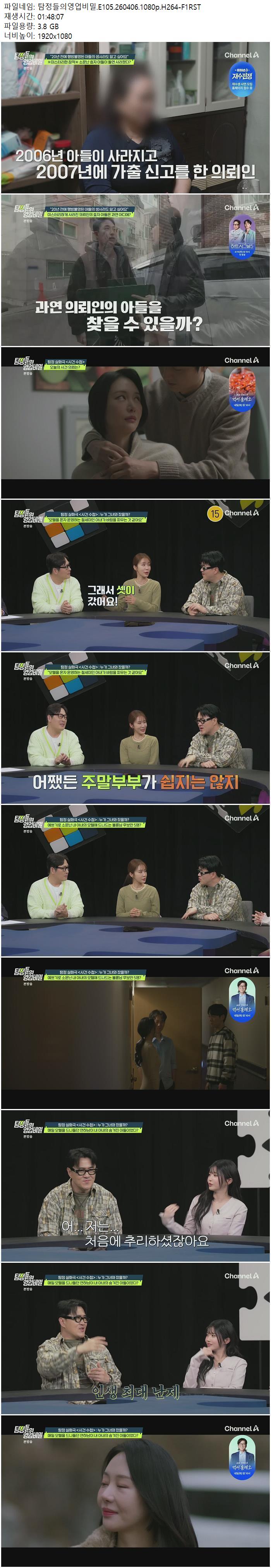 방송/동영상 방송/동영상 탐정들의영업비밀.E105.260406.1080p.H264-F1RST lizard21 2026.04.24 6,353 444 다운로드 추천 444 북마크 공유 다운로드 파일 · 1개 탐정들의영업비밀.E105.260406.1080p.H264-F1RST.mp4 FILE 3.8G 다운로드 TAGS #탐정들의영업비밀 #E105 #H264 #F1RST