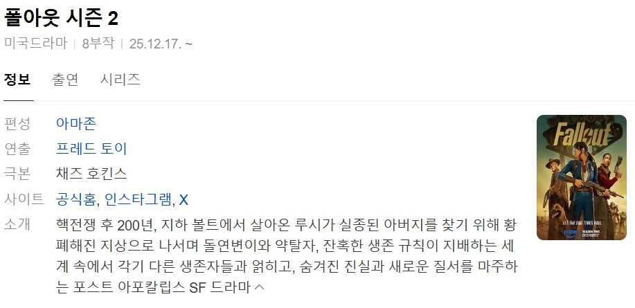 드라마 드라마 폴아웃(Fallout) 시즌2 01화-08화.완결 vandals 2026.04.24 6,477 447 다운로드 추천 447 북마크 공유 폴아웃(Fallout) 시즌2 01화-08화.완결폴아웃(Fallout) 시즌2 01화-08화.완결 다운로드 파일 · 1개 폴아웃(Fallout) 시즌2 01화-08화.완결 FILE 13.6G 다운로드 TAGS #폴아웃 #Fallout #시즌2 #01화 #08화