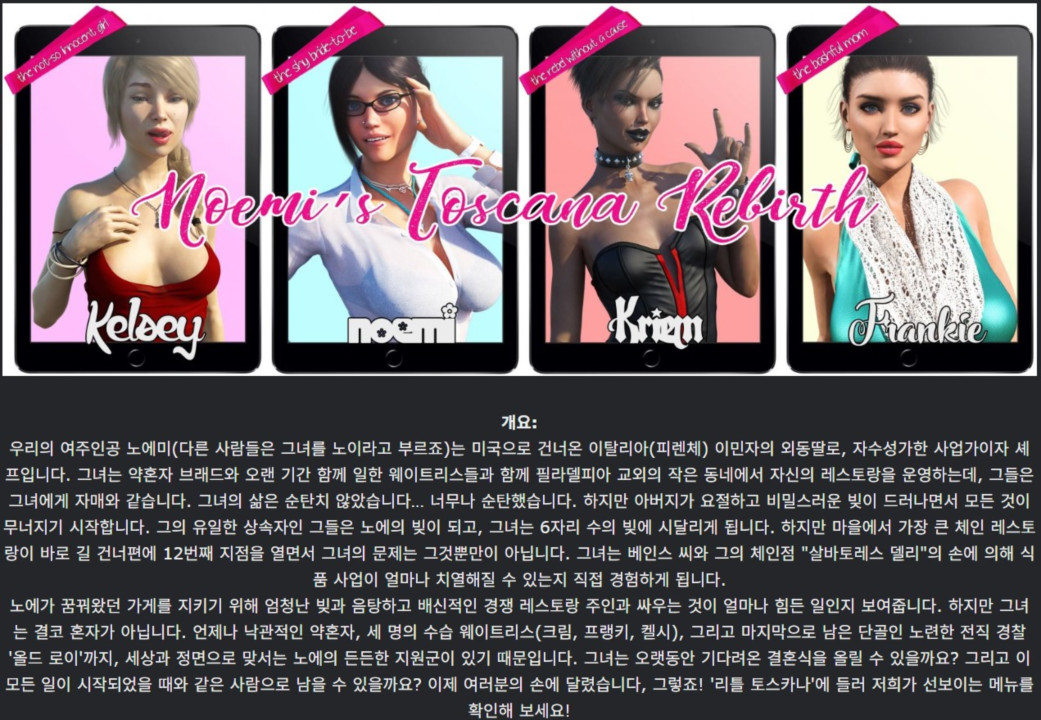 도서 도서 [한글.여주.NTR.업뎃]Noemi s Toscana Rebirth 0.23.zip nksmhsm 2026.04.25 7,611 479 다운로드 추천 479 북마크 공유 다운로드 파일 · 1개 [한글.여주.NTR.업뎃]Noemi s Toscana Rebirth 0.23.zip.ezc FILE 3.0G 다운로드 TAGS #한글 #여주 #NTR #업뎃 #Noemi