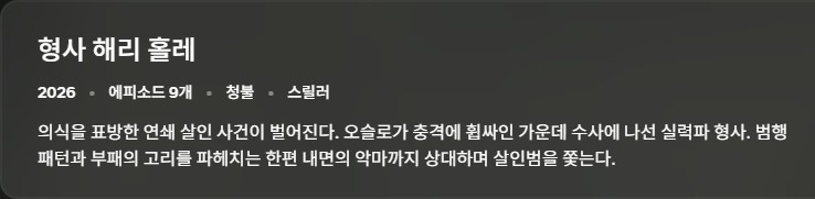 드라마 드라마 [ 형사 해리 홀레 ] 1시즌 1-9화 [완] 1080p 고화질 한글자막 fjdlkas 2026.04.22 5,801 249 다운로드 추천 249 북마크 공유 다운로드 파일 · 1개 형사 해리 홀레 1시즌 1-9화 [완] 1080p 고화질 한글자막 FILE 4.4G 다운로드 TAGS #형사 #해리 #홀레 #1시즌 #9화