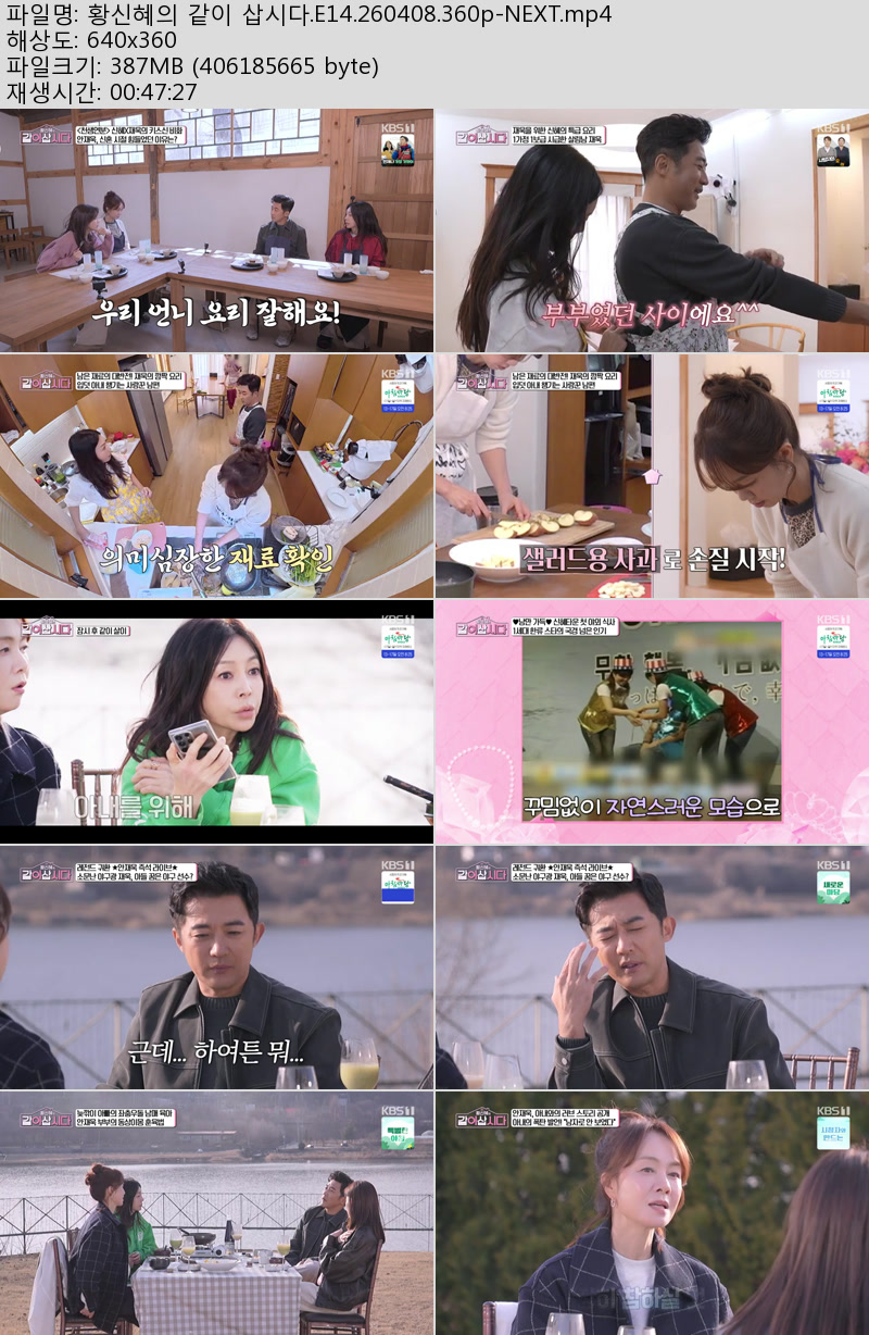 방송/동영상 방송/동영상 황신혜의 같이 삽시다.E14.260408.360p-NEXT 우야쓰꼬 2026.04.24 7,680 299 다운로드 추천 299 북마크 공유 다운로드 파일 · 1개 황신혜의 같이 삽시다.E14.260408.360p-NEXT.mp4 FILE 387.4M 다운로드 TAGS #황신혜의 #같이 #삽시다 #E14 #NEXT