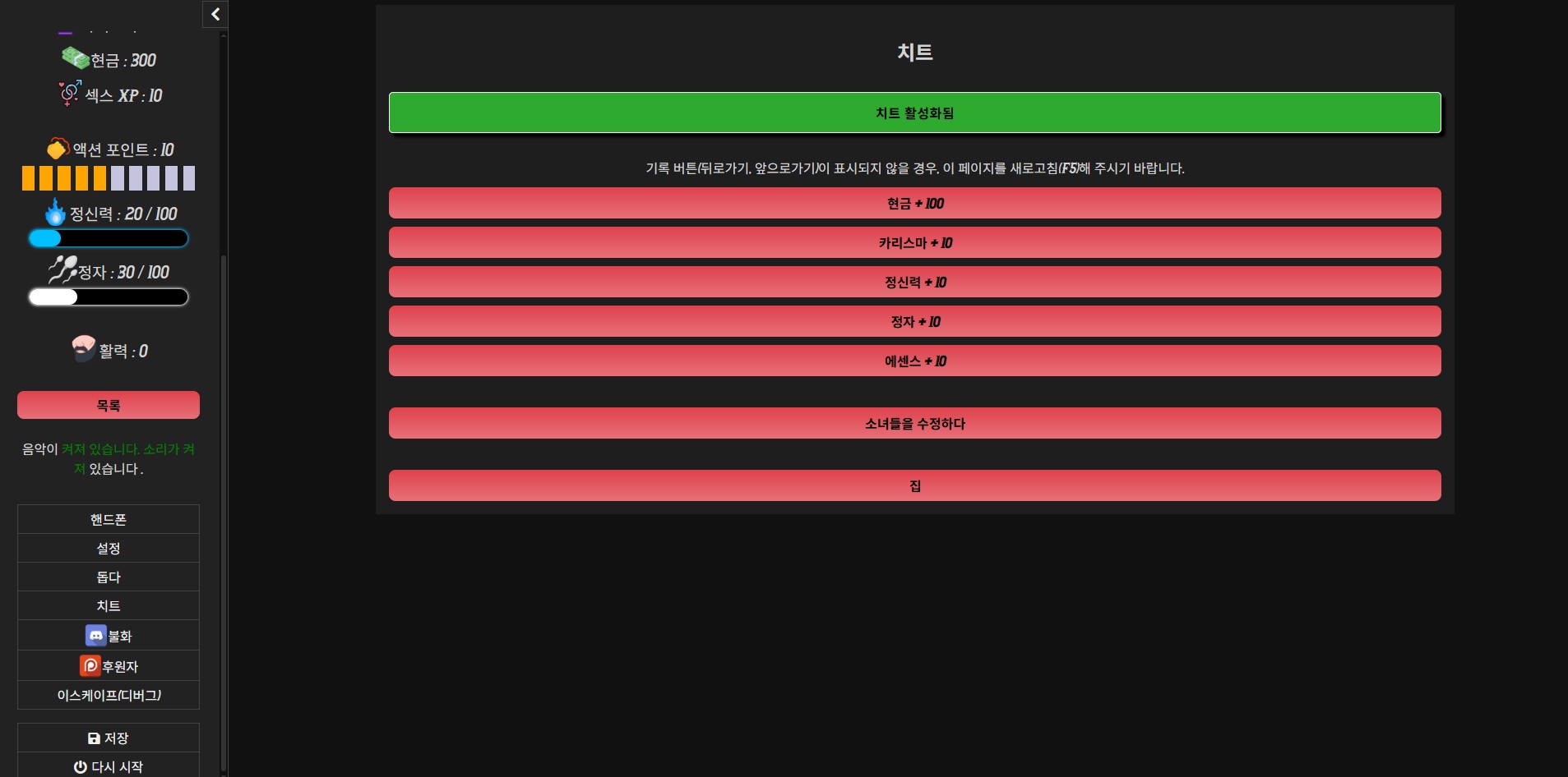 시작 스탯이 약간 개선되었고, 모든 하드코딩 대기 시간이 1초로 줄어들었으며, 성관계 중 여성이 소모하는 지구력이 감소했습니다. 최대 액션 포인트가 20으로 증가했습니다. 치트 코드는 12345로 변경되었습니다.