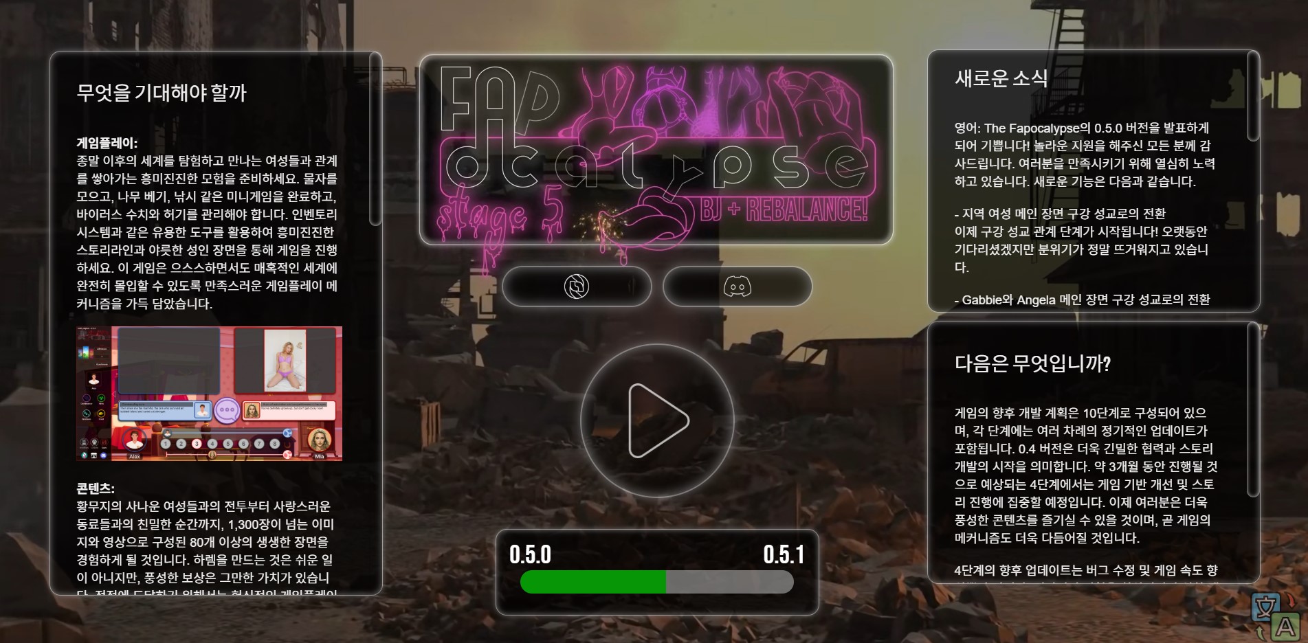 곳곳에 위험이 도사리고 D-POX 바이러스의 진실이 밝혀지기를 기다리는 가운데, "Fapocalypse"는 당신의 성적 한계를 극한으로 끌어올릴 잊지 못할 성인 게임 경험을 약속합니다. 최고의 알파 남성이 되어, 당신을 가장 필요로 하는 여성들을 부양하고 보호하며, 한 번에 한 번의 짜릿한 오르가즘으로 세상을 구할 자질이 있으신가요? 지금 바로 "Fapocalypse"를 플레이하고 그 비밀을 알아보세요.