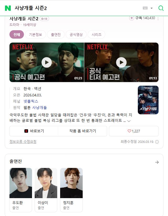 드라마 드라마 1080p 사냥개들 시즌2 E01-E07 통합8 19금 우도환 이상이 정지훈 [.. 하늘아래소 2026.04.22 5,369 405 다운로드 추천 405 북마크 공유 다운로드 파일 · 1개 1080p 사냥개들 시즌2 E01-E07 통합8 19금 우도환 이상이 정지훈 [완결]... FILE 7.4G 다운로드 TAGS #사냥개들 #시즌2 #E01 #E07 #통합8