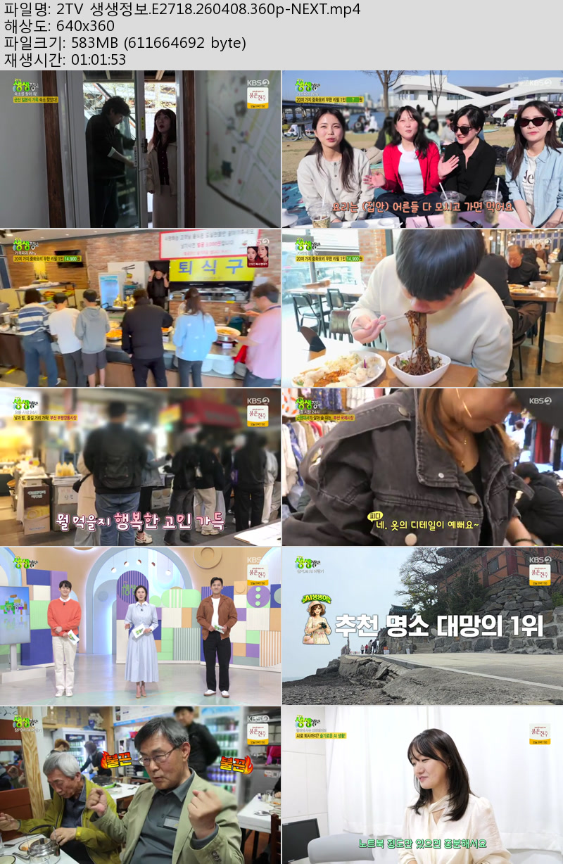 방송/동영상 방송/동영상 2TV 생생정보.E2718.260408.360p-NEXT 우야쓰꼬 2026.04.24 4,743 234 다운로드 추천 234 북마크 공유 다운로드 파일 · 1개 2TV 생생정보.E2718.260408.360p-NEXT.mp4 FILE 583.3M 다운로드 TAGS #2TV #생생정보 #E2718 #NEXT
