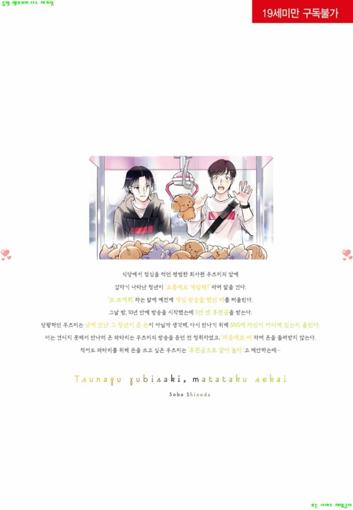 만화 만화 [BL만화] 시노다 소바 - 이어진 손끝 반짝이는 세계 디스사랑 2026.04.25 6,524 246 다운로드 추천 246 북마크 공유 다운로드 파일 · 1개 [BL만화] 시노다 소바 - 이어진 손끝 반짝이는 세계 FILE 136.0M 다운로드 TAGS #BL만화 #시노다 #소바 #이어진 #손끝