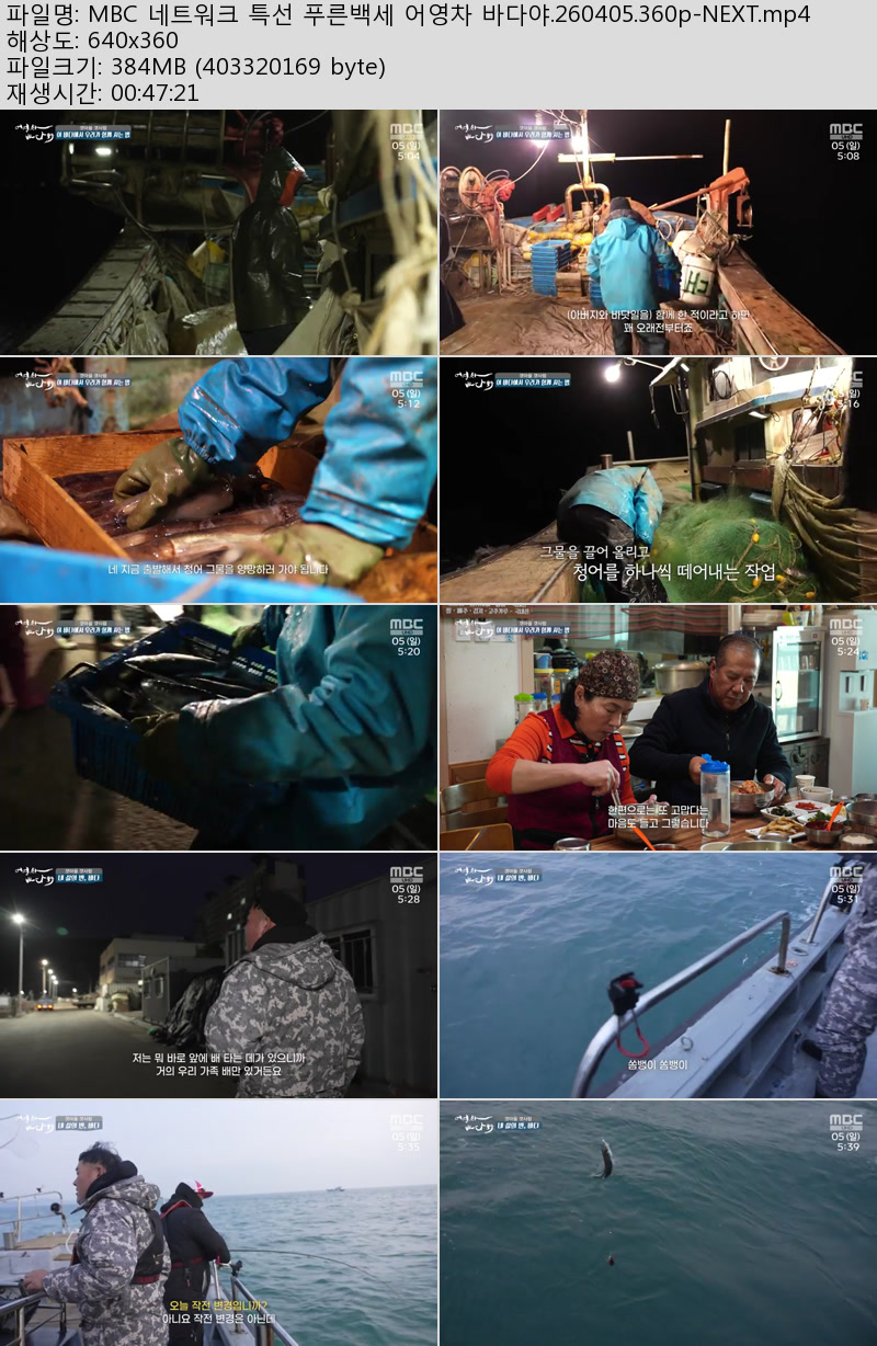 방송/동영상 방송/동영상 MBC 네트워크 특선 푸른백세 어영차 바다야.260405.360p-NEXT 우야쓰꼬 2026.04.24 5,897 280 다운로드 추천 280 북마크 공유 다운로드 파일 · 1개 MBC 네트워크 특선 푸른백세 어영차 바다야.260405.360p-NEXT.mp4 FILE 384.6M 다운로드 TAGS #MBC #네트워크 #특선 #푸른백세 #어영차