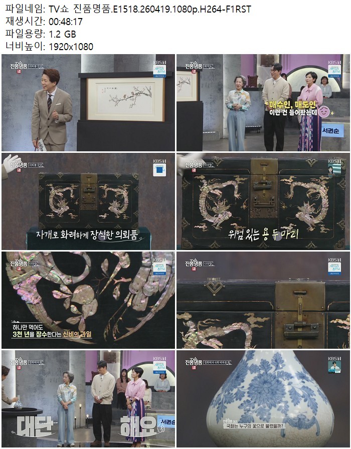 방송/동영상 방송/동영상 TV쇼 진품명품.E1518.260419.1080p.H264 디스사랑 2026.04.22 5,618 475 다운로드 추천 475 북마크 공유 다운로드 파일 · 1개 TV쇼 진품명품.E1518.260419.1080p.H264-F1RST.mp4 FILE 1.2G 다운로드 TAGS #TV쇼 #진품명품 #E1518 #H264 #F1RST