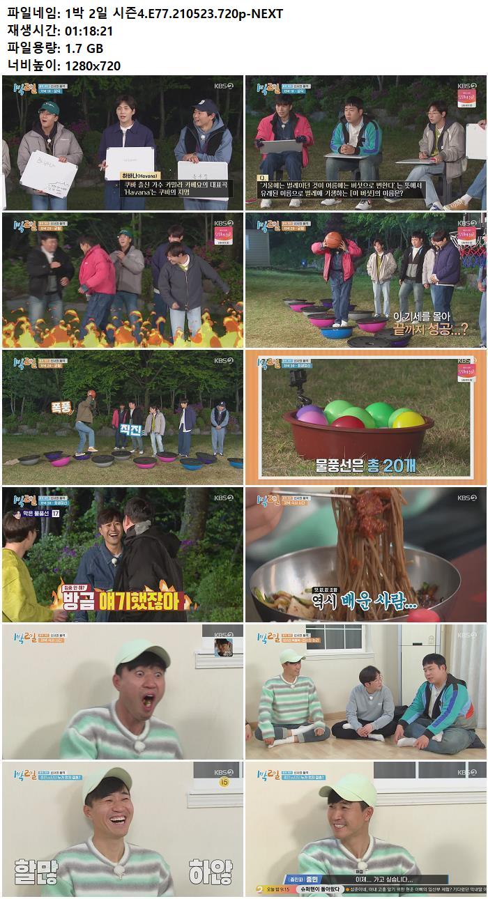 • 1박 2일 시즌4.E77.210523.720p-NEXT.torrent (1.7G) 다운로드 : 41,322