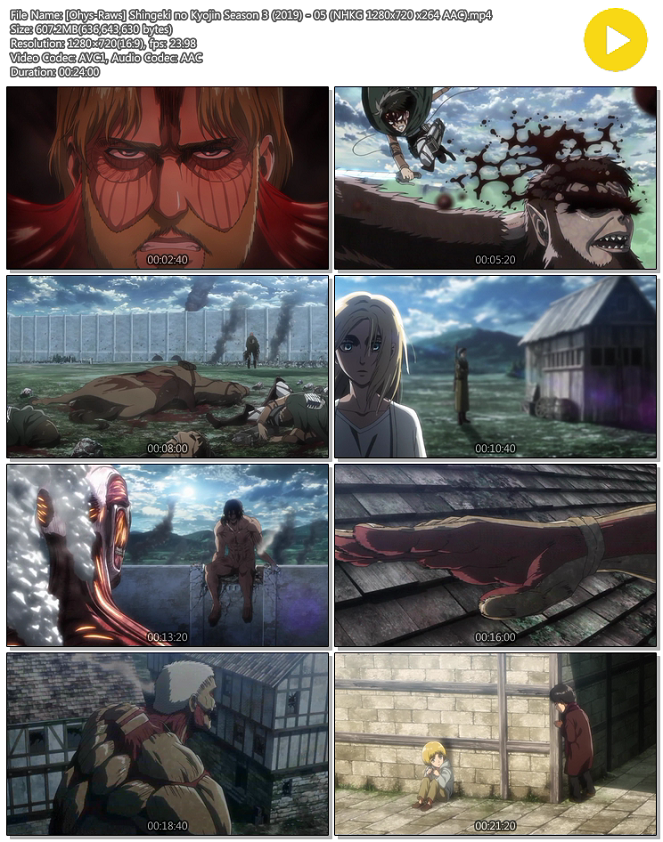 - [Ohys-Raws] Shingeki no Kyojin Season 3 (2019) - 05 (NHKG 1280x720 x264 AAC).mp4|[Ohys-Raws] Shingeki no Kyojin Season 3 (2019) - 05 (NHKG 1280x720 x264 AAC).torrent (607.2M) 다운로드 : 42,211