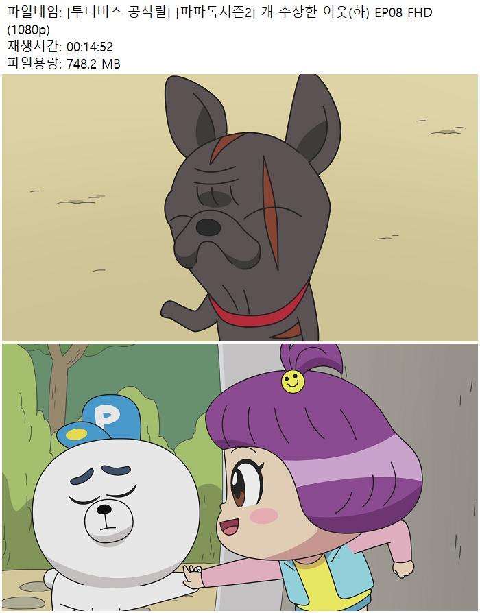 - [투니버스 공식릴] [파파독시즌2] 개 수상한 이웃(하) EP08 FHD (1080p).mp4 (748.2M) 다운로드 : 46,000