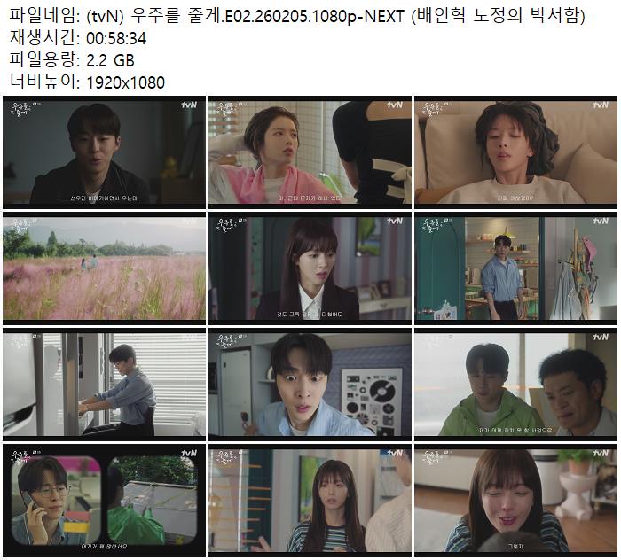 드라마 드라마 (tvN) 우주를 줄게.E02.260205.1080p-NEXT (배인혁 노정의 박서함) ceasar1995 2026.04.24 5,740 355 다운로드 추천 355 북마크 공유 다운로드 파일 · 1개 (tvN) 우주를 줄게.E02.260205.1080p-NEXT (배인혁 노정의 박서함).mp4 FILE 2.2G 다운로드 TAGS #tvN #우주를 #줄게 #E02 #NEXT