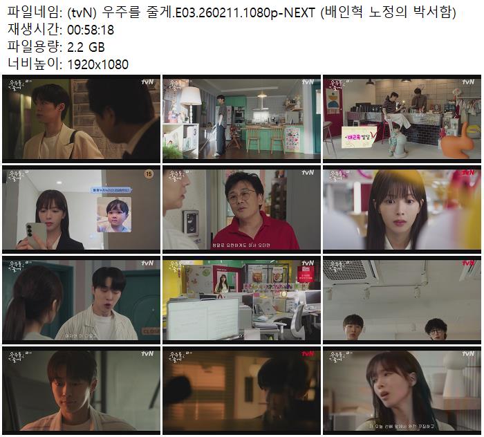 드라마 드라마 (tvN) 우주를 줄게.E03.260211.1080p-NEXT (배인혁 노정의 박서함) ceasar1995 2026.04.24 5,573 457 다운로드 추천 457 북마크 공유 다운로드 파일 · 1개 (tvN) 우주를 줄게.E03.260211.1080p-NEXT (배인혁 노정의 박서함).mp4 FILE 2.2G 다운로드 TAGS #tvN #우주를 #줄게 #E03 #NEXT